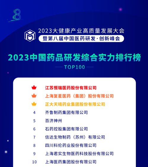 由药智网、中国药业杂志社主办的2023大健康产业高质量发展大会暨第八届中国医药研发•创新峰会于6月16日开幕,会上发布了《2023中国药品研发实力排行榜》系列榜单,AG官网医药凭借深厚的创新研发实力再创辉煌:荣登《2023中国药品研发综合实力排行榜TOP100》榜首、《2023中国化药研发实力排行榜TOP100》榜首。值得一提的是,今年是AG官网医药连续第6年入选《中国药品研发综合实力排行榜》榜首。